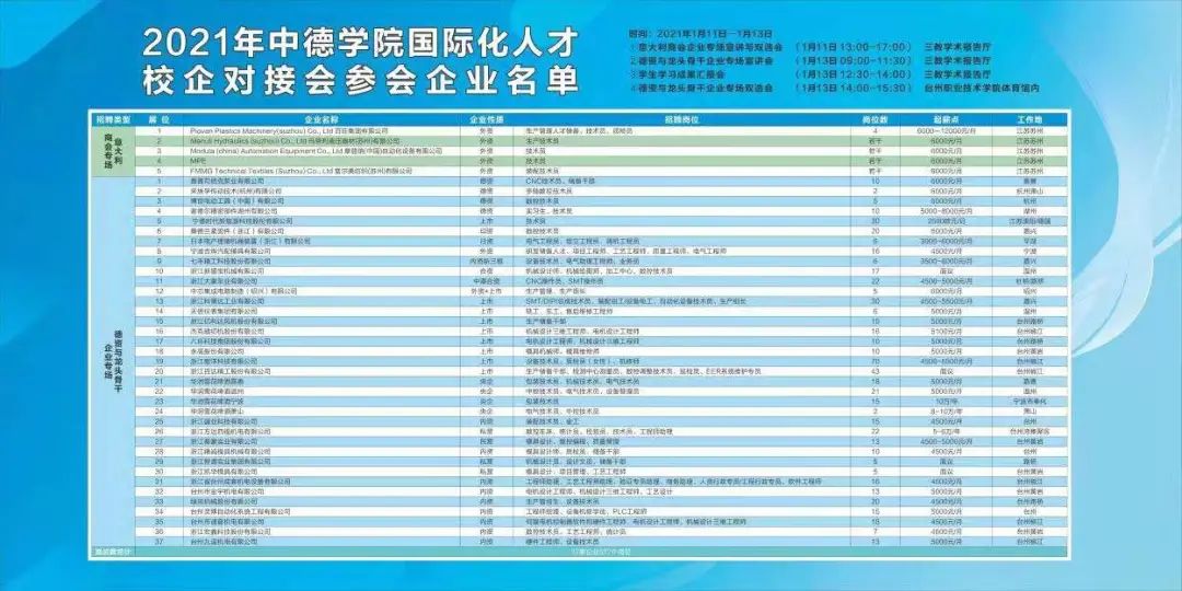 “你看,這家企業(yè)起薪每個月2500歐元呢,要不要去投個簡歷試試?”“這家有提供赴德國工作的機會,感覺未來發(fā)展不錯?!?月13日,臺州職業(yè)技術(shù)學院體育館門口巨大的招聘展板前,中德學院2018屆畢業(yè)生拿著簡歷躍躍欲試。1月11日至13日,2021年臺職院中德學院國際化人才校企對接會舉行,分設(shè)意大利商會專場、德企及龍頭骨干企業(yè)專場和中德學院學生成果發(fā)布會等內(nèi)容。最終,共有250余名學生與48家用人單位達成就業(yè)意向。